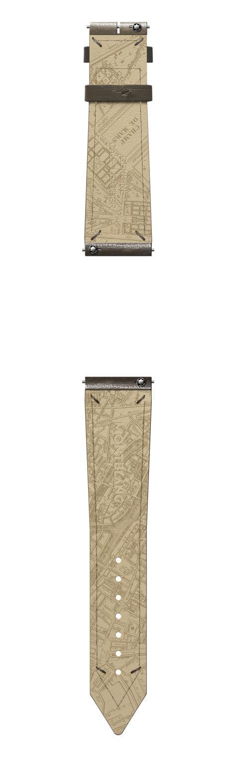 表带内衬更特别融入了巴黎地图,诸多重要地标皆可从中寻见踪迹。熟悉巴黎的腕表藏家可辨识出巴黎市中心的巴黎圣母院与塞纳河,还有1805年至1817年间尼古拉斯·凯世设立工坊的帕吕市场大街14号(14 Rue du Marché-Palu),以及他为滴墨式计时器申请专利期间的工作地小田园新街13号(13 Rue Neuve des Petits Champs)。表带上方区域地图还饰有1821年9月1日那场著名赛马赛事的举办地、见证传奇滴墨式计时器诞生的巴黎战神广场(Le Champ de Mars),以及法国高等军事学府巴黎军事学院(L'Ecole Militaire)。