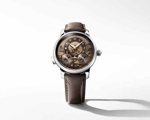 万宝龙明星系列尼古拉斯·凯世计时腕表 巴黎赛马特别款(全球821枚)的表盘之上,鲜活再现了近两个世纪前巴黎赛马的盛景,复刻了灵感源自Victor Adam于1829年创作的19世纪经典插画作品《四位骑师策马飞驰(Four Jockeys storm with their horses)》,描绘出四位骑师策马驰骋于巴黎战神广场赛马场的飒爽画面。表盘采用米色墨韵渐变饰面,为这幅经典图景赋予丰富层次与温润色泽,更添立体质感。表盘外侧的同色凸缘之上,“12点钟”位置镌刻“Chronographe Nicolas Rieussec”(尼古拉斯·凯世计时腕表)字样,“6点钟”位置则镌刻“Academie des Sciences de Paris - 1821”(法国科学院 - 1821)字样,以纪念法国科学院于1821年认证尼古拉斯·凯世的伟大发明,铭记尼古拉斯・凯世在高级制表领域的卓越成就。