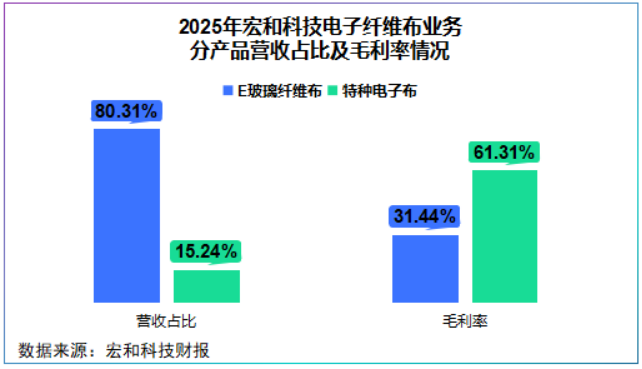 2025年,公司电子级玻璃纤维布营收占比80.31%,毛利率31.44%,特种电子布营收占比15.24%,毛利率高达61.31%。